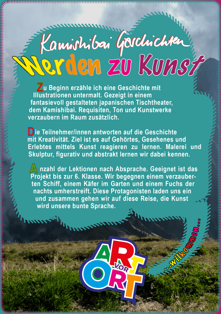 Wir erfinden Geschichten und bauen ein oder mehrere Kamishibai. Theater, Erfinden, Vortragen, Illustrieren und Designen, mit Geräuschen untermalen, Malen und Zeichnen, Ausflüge in die Natur, Ausflüge zu Kulturangeboten und das Arbeiten in der Gruppe, all dies umfasst und thematisiert das Projekt. Die Fantasie der Schüler und Schülerinnen und der pure Spass an der Freude stehen an erster Stelle.